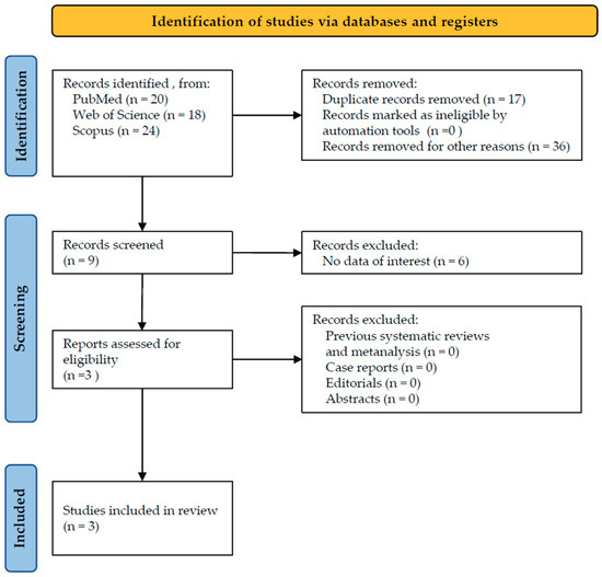 The starting search supplied a total of 62 studies: 20 from PubMed, 18 from Web of Science, and 24 from Scopus. No studies were deleted due to being ineligible by automation tools, while 17 studies were removed because of duplication. Overall, 36 studies were removed for other reasons, for example, for analyzing other molecules, such as triclosan, stannous fluoride, and phytocannabinoids. A total of nine studies were selected for the screening phase, and a total of six studies were withdrawn because they failed to demonstrate any data of interest, for example, because they were conducted in vitro, in animals, on postbiotics, or on chemotherapy-induced oral mucositis. Eligibility was assigned to three studies based on their abstracts; no studies were erased for being systematic reviews, abstracts or editorials. For this reason, a total of three studies were incorporated into the inclusion phase (Figure 1) and analyzed according to their full text.