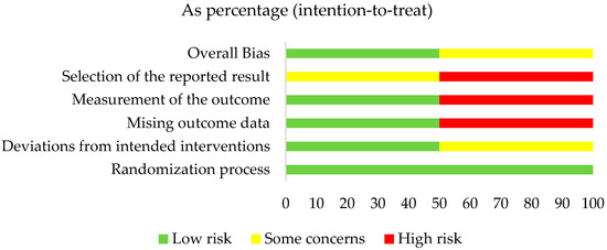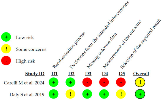 The risk of bias assessment of the two RCTs included was carried out using the Cochrane RoB 2.0 tool. The study by Carelli M. et al. [17] was classified as having some concerns regarding the reported results; the study by Daly S. et al. [18] had a low risk of bias. The details are presented in Figure 2. The overall risk of bias, with each category presented as percentages, is presented in Figure 3.