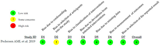 The risk of bias assessment of the included N-RCT was carried out using the Cochrane ROBINS I tool. The study by Pedersen AML. et al. [19] was classified as having a low risk of bias (Figure 4).