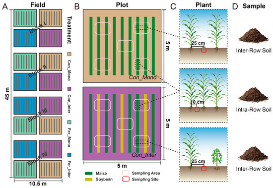 Schematic diagram of the experimental design, field layout, and sample collection. (A) Layout of field experiments. Each individual plot is outlined in black lines. These plots, representing four treatments (yellow: Con_Mono, purple: Con_Inter, green: Fer_Mono, blue: Fer_Inter), were arranged semi-randomly in four blocks. (B) Schematics of Con_Mono (top) and Con_Inter (bottom). Green and yellow bands represent maize and soybean rows, respectively. Pink ovals outline approximate sampling areas in each plot. (C,D) Sampling sites and types for soil collection. Red ovals indicate sampling sites for intra-row and inter-row soils.
