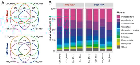 Distributions of the ASVs (A) and dominant phyla (B) of soil bacterial communities for each treatment in intra-row and inter-row soils. Phyla with relative abundances less than 1% were summarized as “Others”.