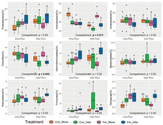 Relative abundances of dominant bacterial phyla in different treatments. Significance of differences between intra-row and inter-row soils was assessed using the Wilcoxon rank sum test. Results are presented at the bottom of each plot, with significant effects highlighted in bold. The separate significance of differences among treatments in intra-row and inter-row soils was assessed using the Kruskal–Wallis test. Different letters indicate significant differences among treatments.