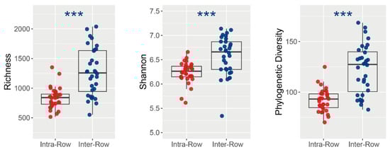 Alpha diversity of soil bacterial communities between intra-row and inter-row soils. Significance of the differences was assessed using the Wilcoxon rank sum test. ***: p < 0.001.