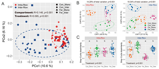 General patterns of bacterial communities were evaluated based on Bray–Curtis distance, and the similarities of compartment and treatment were examined via permutational multivariate analysis of variance (PERMANOVA) and analysis of similarities (ANOSIM). Results showed that compartment variability altered bacterial community structures across all samples. Significant differences were observed between intra-row and inter-row soils (PERMANOVA: R2 = 0.052, p < 0.001; ANOSIM: R = 0.146, p < 0.001; Table S1). These differences were visualized and confirmed using principal coordinate analysis (PCoA), which showed the samples from intra-row and inter-row soils forming distinct clusters in the spatial ordination, accounting for 10.6% (PCo1) and 6.16% (PCo2) of the total variation for the first and second principal coordinate axes, respectively (Figure 6A). Constrained principal coordinate analysis (CAP) based on Bray–Curtis distance further verified these results (Figure S2A). Moreover, Bray–Curtis dissimilarity was significantly higher in inter-row soils compared to intra-row soils (Figure S2B). Furthermore, treatment effects on bacterial communities were also significant as determined by PERMANOVA and ANOSIM (PERMANOVA: R2 = 0.081, p < 0.001; ANOSIM: R = 0.095, p < 0.001; Table S1).