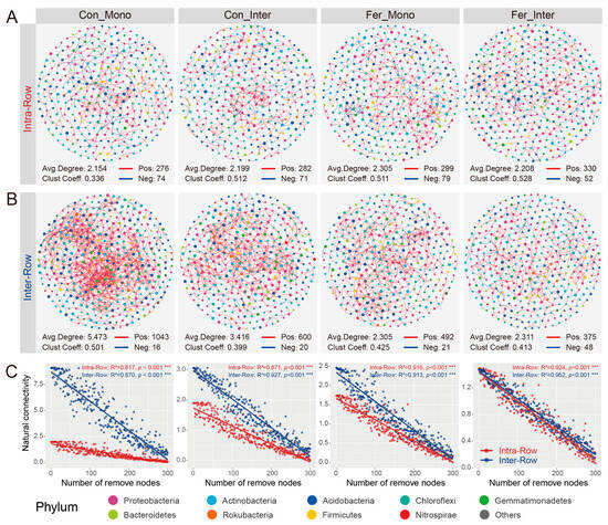 Co-occurrence patterns of bacterial communities among different treatments in intra-row and inter-row soils. (A,B) Co-occurrence networks for each treatment in intra-row (A) and inter-row (B) soils. Networks were constructed by calculating correlations among ASVs (|ρ| > 0.6, p < 0.001). Nodes are colored according to taxonomic classification at the phylum level. Colored edges represent positive (red) and negative (blue) correlations, respectively. Node sizes represent the degree of connections. Topological parameters (number of positive/negative edges, average degree, and clustering coefficient) are presented at the bottom of each plot. (C) Network robustness between intra-row and inter-row soils for each treatment. Results of linear models are displayed at the top of each plot. Colored circles represent intra-row (red) and inter-row soils (blue) soils, ***: p < 0.001.