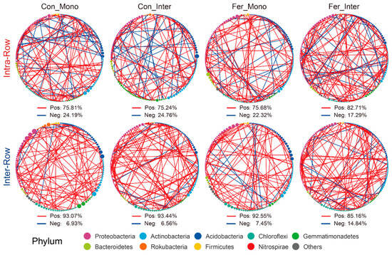 Correlation networks of keystone species for different treatments in intra-row and inter-row soils. Keystone species with correlation coefficients greater than 0.9 were screened. Nodes are colored according to taxonomic classification at the phylum level. Node sizes represent the abundance of keystone species. Colored edges represent positive (red) and negative (blue) correlations.