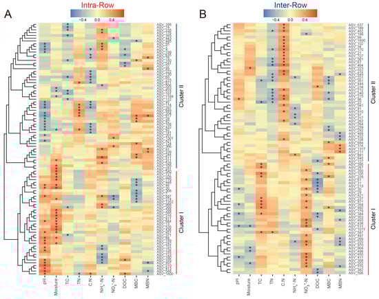 Correlations between keystone species abundance and soil properties in intra-row (A) and inter-row (B) networks. The heatmaps present only the keystone species significantly related to soil properties. Positive (red) and negative (blue) correlations are indicated by color intensity. *: significant correlations.