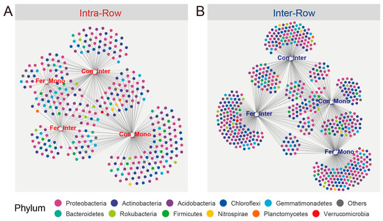 Bipartite networks display indicator species in intra-row (A) and inter-row (B) soils. Specific ASVs significantly associated with one or more treatments were selected. Circles representing individual ASVs are colored according to their phylum assignments.