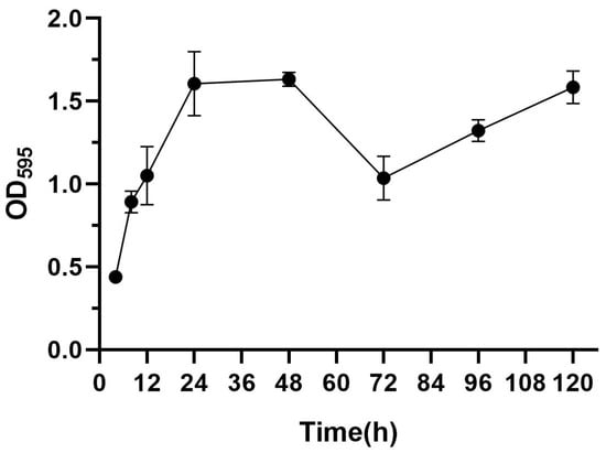 Biofilm formation is divided into five stages (planktonic stage–reversible stage–irreversible stage–mature stage–dispersed stage) []. As shown in Figure 1, the OD values increased progressively with an increase in the incubation time, attaining a peak value of 1.63 at 48 h, indicative of a robust biofilm-forming capacity in this strain [], and the OD peak suggests that the biofilm at this time reached the maturation stage. The OD value decreased at 72 h, and this stage corresponded to the dispersion stage of the biofilm, where part of the biofilm detached from the bacteria and returned to the planktonic state, dispersed to new parts of the bacteria, and carried out a new round of biofilm colonization at this point of disintegration and dispersal, which corresponded to the secondary elevation of the OD value at 92 h. Thus, in subsequent experiments, the biofilm incubation time was chosen to be 48 h.