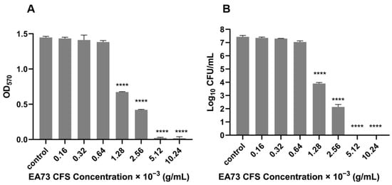 The MBEC of the EA73 CFS against S. aureus was determined via crystal violet staining and CFU counting. As shown in Figure 2, when the concentration of EA73 CFS reached 1.28 × 10−3 g/mL, the OD value of the experimental group was significantly lower than that of the control group (p < 0.0001), and the amount of biofilm was significantly reduced (Figure 2A). In the CFU counting method, at this concentration, the number of bacteria in the experimental group was reduced compared to the control group by 103.5 CFU/mL (Figure 2B). The combined results show that the MBEC of EA73 CFS against S. aureus was 1.28 × 10−3 g/mL.