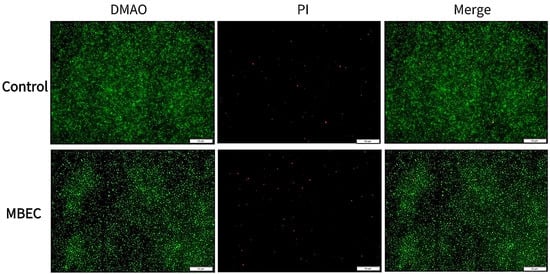 Five milliliters of sterile TSB, a 1% (v/v) S. aureus bacterial suspension (1 × 108 CFU/mL), and one piece of sterile coverslip (2 cm × 2 cm) were added to 6-well plates. The culture was incubated at 37 °C for 48 h to form biofilms, after which the TSB was discarded, the biofilms were washed with sterile PBS, and then, EA73 CFS was added at concentrations of MBEC, which corresponded to concentrations of 1.28 × 10−3 g/mL, with the wells without EA73 CFS added as a control group. The plates were incubated at 37 °C for 4 h, and after incubation, the coverslips were removed, and cells were stained using the LIVE/DEAD Bacterial Staining Kit (Beyotime Co., Ltd., Shanghai, China), according to the instructions, and were analyzed using a fluorescence microscope (Olympus DP75, Tokyo, Japan) [].