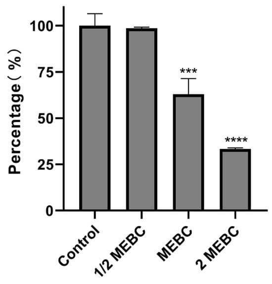 After incubation of the biofilm and CFS treatment, the planktonic bacteria were rinsed with sterile PBS, and the biofilm was stained with 0.1% crystal violet for 15 min. After, it was rinsed with sterile PBS and dissolved with 95% ethanol. The OD value at 595 nm of the solution in the culture wells was determined via a multifunctional fluorescence chemiluminescence immunometer. MBEC has the lowest concentration of an antimicrobial substance that eradicates 99.9% of biofilm-embedded bacteria (3 log10 reduction in CFU/mL) compared to growth controls [].