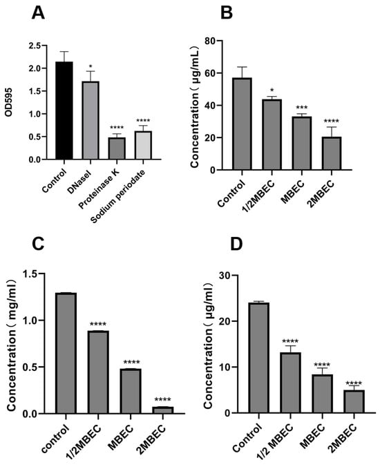 The biofilms were cultured on 6-well plates, according to the method described previously, and after incubation, the medium was discarded and washed slowly with sterile PBS to discard floating bacteria. Four groups were set up for the experiment, of which 1 group was a blank control group, and the remaining 3 groups were the experimental groups, and 3 wells were set up for each group. A total of 5 mL of sterile PBS was added to the blank control group, and equal amounts of sodium periodate (10 μM), DNaseI (2 mg/mL), and proteinase K (100 μg/mL) diluted to a fixed concentration with sterile PBS were added to the test group to perform enzyme digestion experiments [,]. The 6-well plates were then incubated at 37 °C for 2 h, and after, the medium was discarded. The planktonic bacteria were rinsed slowly with sterile PBS, and the biofilm was stained with crystal violet. The PBS was washed and decolorized with ethanol for 30 min, and the OD value of the solution at 595 nm was measured with a multifunctional fluorescence chemiluminescence immunometer.
