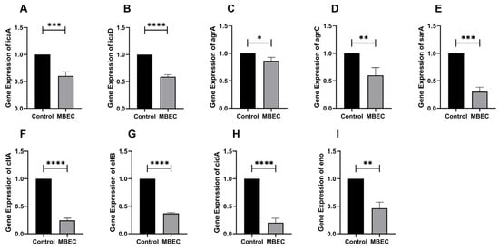As shown in Figure 7, when 9 biofilm-related genes were transformed by MBEC EA73 CFS, the expression of icaR increased by 49.5%, and the expression of icaA, icaD, agrA, agrC, sarA, cidA, clfA, clfB, and eno decreased by 39.6%, 40.9%, 13.7%, 39.9%, 69.8%, 79.8%, 75.5%, 63.1%, and 53.7%, respectively.