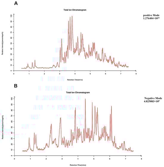 Total ion chromatogram, TIC. (A) Positive mode; (B) negative mode.