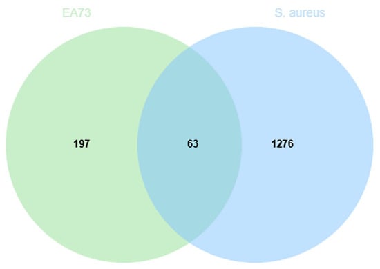 A Swiss TargetPrediction analysis (p > 0.5) identified 197 potential active ingredient targets of EA73 CFS and 1276 S. aureus-mediated disease targets through the GeneCards and DisGeNET databases and imported 197 EA73 CFS ingredient targets and 1276 S. aureus-mediated disease targets into Venny 2.1.0 to obtain 63 intersecting targets (Figure 9).