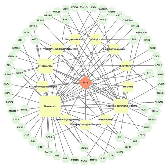 A total of 63 potential targets of the main components of the EA73 fermentation broth were obtained from the SwissTargetPrediction database. The main components and their corresponding targets were imported into Cytoscape 3.9.1 to draw the visualized network diagram (Figure 10), and the connected edges represent the correspondence of drug-active ingredient–target–disease interactions. Among them, Nevadensin, 2-Tridecanone, N6-(delta 2-Isopentenyl)-adenine, and (R)-2-Hydroxy-4-methylpentanoic acid had the most targets of action, with degree values of 33, 15, 14, and 5, respectively, which suggests that these components may play an important role in interactions with S. aureus-mediated diseases.