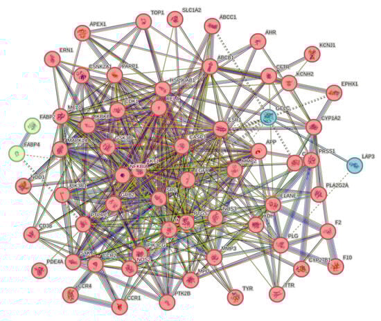 Through the STRING (https://string-db.org/, accessed on 20 December 2024) platform, we imported the common targets of the component genes and disease genes, set the object as “Staphylococcus aureus”, and hid the free gene nodes with the highest confidence level of 0.900 to obtain the interaction relationship of protein–disease interactions.