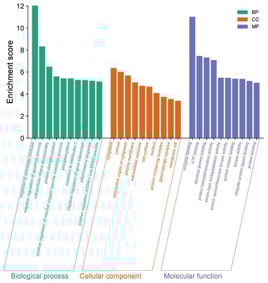 Gene Ontology (GO) enrichment analysis yielded a total of 387 results, of which 272 were BP (Biological process), 43 were CC (Cellular component), and 72 were MF (Molecular function), which were screened according to −log10 (p-value) (Figure 12). Of these, BP was mainly associated with the response to exogenous stimuli, the negative regulation of apoptosis, extracellular matrix catabolism, protein phosphorylation, and the positive regulation of reactive oxygen species metabolism. CC was mainly associated with the cytoplasm, cytoplasmic lysate, cytoplasmic perinuclear region, and the cell membrane, and MF was associated with enzyme binding, ATP binding, homologous protein binding, protein homodimerization activity, etc.