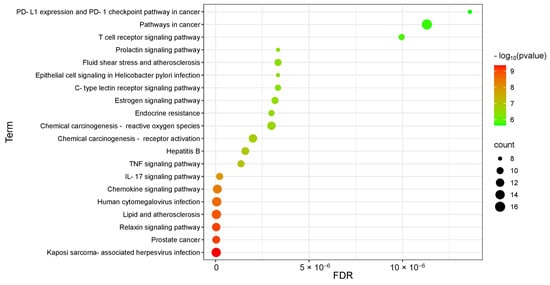 A total of 122 pathways were obtained from the Kyoto Encyclopedia of Genes and Genomes (KEGG) pathway enrichment analysis (Figure 13). The enrichment results indicate that the mechanism of action of EA73 CFS may be closely related to Bordetella sarcoma-associated herpesvirus infection, prostate cancer, the relaxin signaling pathway, lipids and atherosclerosis, human cytomegalovirus infection, the chemokine signaling pathway, the IL-17 signaling pathway, and other pathways.