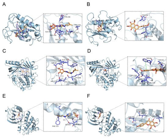 The key active ingredients screened in the “Ingredient–Target–Drug” network were used as ligands, and the core targets screened in the protein–protein interaction (PPI) network were used as receptors, and the structural files of the compounds were retrieved through the pubchem website (https://pubchem.ncbi.nlm.nih.gov/, accessed on 20 December 2024) and converted into PDB files using the Open Babel 2.3.2 software. The SDF files were converted into PDB files using the Open Babel 2.3.2 software. The receptor proteins were retrieved from the PDB database to obtain the receptor proteins. The PYMOL 2.3.4 software was used to dehydrate and de-ligand the receptor protein, and the AutoDockTools 4.2 software was used to modify the receptor protein with hydrogenation and a balanced charge, and the receptor protein and ligand small molecules were converted into pdbqt format, respectively. Molecular docking of receptor proteins and ligand small molecules was performed using AutoDock Vina 1.1.2, and the docking results were analyzed using PLIP. The docking results were visualized using PyMOL 2.6.
