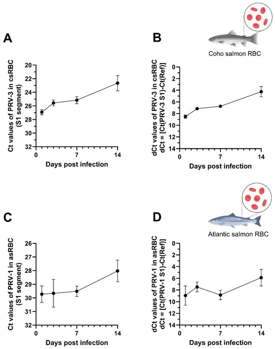 PRV kinetics in salmonid RBC ex vivo. (A) PRV-3 Ct values in coho salmon RBC (csRBC) and (B) normalized to the housekeeping gene (β-ActinA). (C) PRV-1 Ct values in Atlantic salmon RBC (asRBC) and (D) normalized to the housekeeping gene (ef1α). Bars represent the mean ± standard error (SE) (n = 3). PRV Ct values for the S1 segment were measured by RT-qPCR in RBC at 1, 3, 7, and 14 days post-infection (dpi).