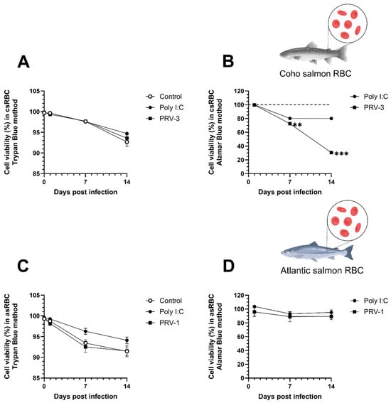 RBC viability assays after PRV infection. (A) Trypan blue viability assay and (B) Alamar blue viability assay performed on coho salmon RBC (csRBC) after treatment with PRV-3 and Poly I:C (50 µg/mL) for 14 days. (C) Trypan blue viability assay and (D) Alamar blue viability assay performed on Atlantic salmon RBC (asRBC) after treatment with PRV-1 and Poly I:C (50 µg/mL). Bars represent the mean ± standard error (SE) (n = 3). Significant differences are represented by ** p < 0.01, and *** p < 0.001, two-way ANOVA, Tukey’s post hoc analysis.