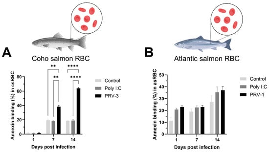 Annexin V binding in RBC ex vivo. (A) Percentage of Annexin V-positive cells in csRBC infected with PRV-3 and Poly I: C. (B) Percentage of Annexin V-positive cells in asRBC infected with PRV-1 and Poly I:C. Bars represent mean ± standard error for each treatment (n = 3) at 1, 7, and 14 dpi. Asterisks represent significant differences, represented as ** p < 0.01 and **** p < 0.0001, two-way ANOVA, Tukey’s post hoc analysis.