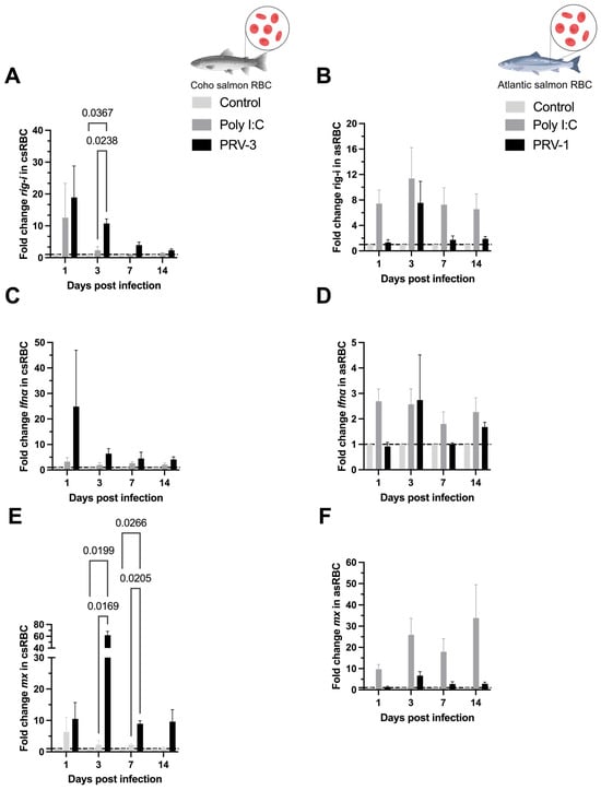 Expression of antiviral immune response transcripts (mRNA) in coho salmon RBC (csRBC) (A,C,E) and Atlantic salmon RBC (asRBC) (B,D,F) ex vivo. The expression levels of rig-i (A,B), ifnα (C,D), and mx (E,F) were assessed using RT-qPCR. Data are presented as the mean ± standard error for each treatment: Control, Poly I:C (50 µg/mL), PRV-1 infection in asRBC (n = 3), and PRV-3 infection in csRBC (n = 3) at 1, 3, 7, and 14 dpi. The fold change is represented based on the control (line) using the ΔΔCT method and normalized against β-actinA for csRBC and ef1α for asRBC. Significant differences are represented by two-way ANOVA, Tukey’s post hoc analysis.
