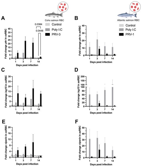 Expression of antiviral immune response transcripts (mRNA) in coho salmon RBC (csRBC) (A,C,E) and Atlantic salmon RBC (asRBC) (B,D,F) ex vivo. The expression levels of pkr (A,B), isg15 (C,D), and viperin (E,F) were assessed using RT-qPCR. Data are presented as the mean ± standard error for each treatment: Control, Poly I:C (50 µg/mL), PRV-1 infection in asRBC (n = 3), and PRV-3 infection in csRBC (n = 3) at 1, 3, 7, 14 dpi. The fold change is represented based on the control (line) using the ΔΔCT method and normalized against β-actinA for csRBC and ef1α for asRBC. Significant differences are represented by two-way ANOVA, Tukey’s post hoc analysis.