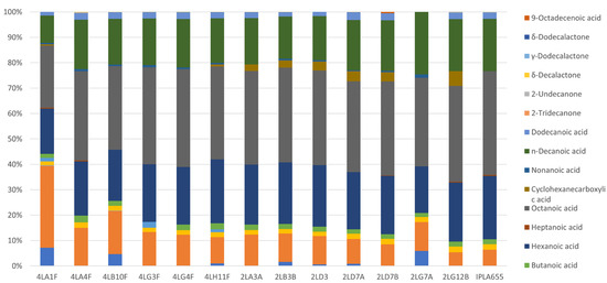 The concentrations of the different volatile compounds identified in the milk before and after inoculation with the different strains of E. durans are shown in Table 7. The 26 detected compounds were grouped according to the following classes: aldehydes (2), ketones (6), lactones (3), acids (12), alcohols (2), and sulphur compounds (1). While ketones and acids were the main constituents of non-inoculated milk (relative abundances 45% and 40%, respectively), in the fermented milk, this profile altered drastically, with the acid group becoming the majority (90%) and with ketones reduced to 7%. Some compounds tended to be consumed (acetaldehyde, benzaldehyde, 2-pentadecanone, and 2-heptanone) while others were produced, mainly acetic acid, butanoic acid, hexanoic acid, octanoic acid, nonanoic acid, n-decanoic acid, 9-decenoic acid, dodecanoic acid, and acetoin. Figure 2 shows the relative abundance of the compounds produced by each of the E. durans strains. Overall, no drastic differences were observed among the isolates, with the main compounds produced being acetic acid (ranging from 5.4% to 30.4%), octanoic acid (23.0–37.9%) and hexanoic acid (16.8–25.2%). However, some compounds were not produced by all strains. One of the most important was acetoin, a compound of great interest, since it is associated with a pleasant buttery aroma; this was only produced by strains 4LA1F, 2LB3B, 2LD3, 2LD7A, and 2LG7A (0.9–6.7%). Benzoic acid, which was produced by strains 4LA1F, 4LG3F, and 4LH11F (1.2–1.3%), is associated with pleasant aromas. Cyclohexanecarboxylic acid, which is associated with fruity aromas, was produced only by 4LA1F, 4LH11F, 2LA3A, 2LB3B, 2LD3, 2LD7A, 2LD7B, and 2LG12B (0.5–5.8%).