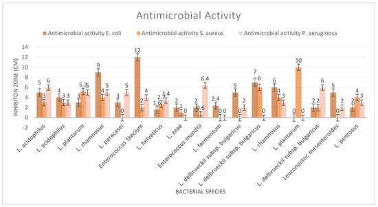 The agar double-layer method, as per Kamel et al., was employed to evaluate the antimicrobial activity of probiotic bacteria against a panel of pathogenic strains that are clinically significant and commonly associated with infections (Table 1) [30]. Briefly, 20 μL of the probiotic suspension (108 CFU mL−1) in sterile distilled water was spot-inoculated onto MRS agar plates. After incubation under optimal conditions for 48 h, 50 μL of chloroform (34854 Sigma-Aldrich, Steinheim, Germany) was added to the probiotic strains and left for 15 min in a laminar flow cabinet. The pathogens (E. coli, S. aureus, P. aeruginosa) were grown separately in broth, and 1 mL of each pathogenic suspension (108 CFU mL−1) of E. coli, S. aureus, and P. aeruginosa was combined with 3 mL of TSA (0.6% agar) (22091 Merck, Germany) at 45 °C and poured over the pre-inoculated probiotic strains on the MRS plates, and the plates were allowed to solidify. To ensure accuracy and comparability, a probiotic strain (Lacticaseibacillus rhamnosus GG) was used as a positive control to validate the antimicrobial activity of tested strains, and MRS agar plates without probiotic inoculation served as a negative control. After incubation at 37 °C, the plates were examined for the presence of inhibition zones.