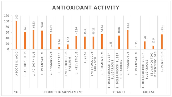 L. plantarum, L. rhamnosus, and L. acidophilus have emerged as potent probiotic strains that demonstrate exceptional antioxidant activity. These potential probiotic strains demonstrate high efficacy (over 60%) in combating oxidative stress through free radical scavenging (Figure 2). The 2,2-diphenyl-1-picrylhydrazyl (DPPH) assay, a widely recognized method for evaluating antioxidant activity, has provided substantial evidence for the ability of probiotics to neutralize reactive oxygen species (ROS). The impressive antioxidant capabilities in these lactic acid bacteria have significant implications in both functional food development and therapeutic applications. Further research into the specific mechanisms of action and optimal dosages could pave the way for innovative probiotic-based interventions in both nutrition and medicine.