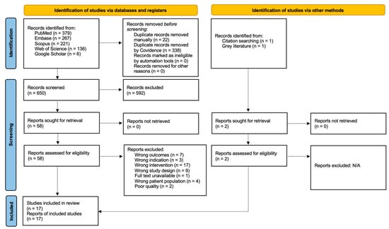 The search strategy described in the previous section yielded 1010 studies, of which 360 were duplicates, detected automatically and manually. Another 592 studies were excluded after title and abstract screening, deemed irrelevant to our review. Full texts of a total of 58 studies were then screened, of which 41 studies were then excluded for having irrelevant outcomes, indications, interventions, study designs, patient populations, and so forth. Articles with unavailable full texts were also excluded because they could not be accessed. The quality assessment then led to one study being excluded for being of poor quality, meaning that 16 studies were included in the final analysis. The excluded study had a small sample size, which could lead to sampling error and provide deviant results from the true population. The entire quality assessment is depicted in Table S1, in the Supplementary Materials.