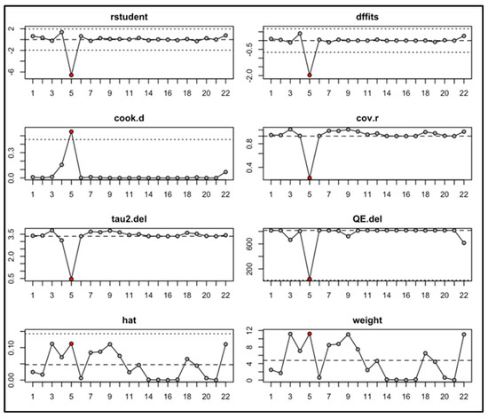 Diagnostic influence and sensitivity analysis for identifying outlier and influential studies in meta-analysis. Visualization of (Y-axis) studentized residuals (rstudent), difference in fits (DFFITS), Cook’s distance (cook.d), covariance ratios (cov.r), tau-squared deletion (tau2.del), Q-statistic deletion (QE.del), hat values (hat), and study weights (weight) across (X-axis) study or observation numbers (1–22).