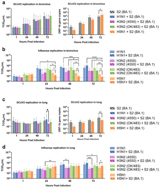 From the human bronchus explants, we demonstrated that co-infections with the H1N1, H3N2 (4550), H3N2 (OK/483), and H5N1 influenza viruses did not significantly affect the SARS-CoV-2 replication compared with SCoV2/BA.1 single-infection (Figure 1a). On the other hand, co-infection with SCoV2/BA.1 significantly reduced the replication of influenza H5N1 but not the other strains at 24, 48, and 72 hpi (Figure 1b) and in the resultant AUC (Figure S1a) compared with the respective single infections. In the human lung tissue explants, SCoV2/BA.1 was found to have overall lower viral titers than in the bronchus tissues with or without influenza virus co-infections (Figure 1c). There were no significant changes in the replications of influenza H1N1, H3N2, H5N1, or SARS-CoV-2 from the co-infections (Figure S1b), except that the co-infection reduced SCoV2 replication but promoted the influenza H5N1 titers at 72 hpi compared with the respective single infections (Figure 1c,d).