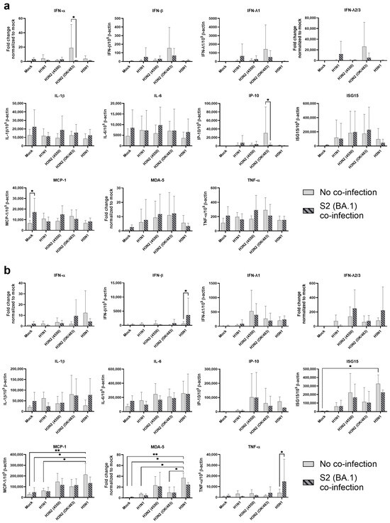 In the bronchial tissue lysates, SCoV2/BA.1 infection resulted in a significant induction in the MCP-1 mRNA level compared with the mock-infected samples (Figure 2a). There were no statistical differences in the cytokine expressions between the single infections of different influenza A viruses. However, H3N2 (OK/483) infection showed trends of upregulation in cytokine induction including IFN-α, IFN-β, IFN-λ1, IFN-λ2/3, and IP-10, while co-infection with SCoV2/BA.1 reduced the levels of these cytokines and chemokines. Furthermore, co-infection with H1N1 or H3N2 (OK/483) enhanced the induction of IFNs, IP-10, ISG15, MDA-5 when compared with SCoV2/BA.1 single infection.