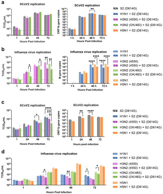 Replication kinetics of influenza A virus and SARS-CoV-2 co-infection in human airway and alveolar epithelial cells. Viral replications of SCoV2/D614G (a,c) and influenza A viruses (b,d) in the human airway epithelial cells Calu-3 (a,b) and alveolar epithelial cells A549/ACE2 (c,d). The viral replications were determined by infectious titers using TCID50 assays or viral gene copies of SARS-CoV-2 (ORF1b) and influenza A (matrix M gene) using quantitative PCR. The dotted lines denote the limit of detection in the TCID50 assay. Data are presented as the mean values ± SD (N ≥ 3), analyzed with two-way ANOVA followed by Tukey’s test. * p < 0.05; ** p < 0.01; *** p < 0.001; **** p < 0.0001.