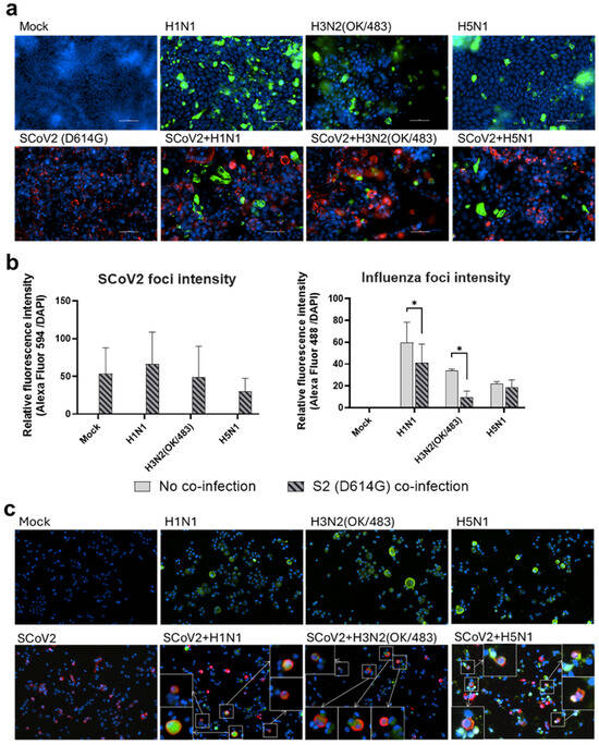Since the SARS-CoV-2 Omicron (BA.1) variant induced weak immune responses in human lung and bronchial tissues, and due to donor–donor variations, our findings suggest that ex vivo models may not be a suitable model for the assessment of innate immune responses upon virus infection. Therefore, we used the SARS-CoV-2 D614G variant, which has been shown to be a strong cytokine inducer [14], to study its interaction with influenza A viruses during co-infection in the human airway and alveolar epithelial cells. Differentiated airway epithelial Calu-3 cells cultured in the air–liquid interface were used as an in vitro model of the human upper airway. Co-infection of SCoV2/D614G with different influenza A viruses did not have a significant impact on the replication of SARS-CoV-2 in the airway epithelial cells (Figure 3a and Figure S2a). On the other hand, the co-infections significantly reduced the replication of H1N1, H3N2 (4550), H3N2 (OK/483), and H5N1 compared with the corresponding single infections (Figure 3b and Figure S2b). These data suggest that airway epithelial cells are more susceptible to SARS-CoV-2/D614G replication than the influenza A viruses during co-infection. The immunofluorescent staining of the SARS-CoV-2 and influenza A viruses in the airway epithelial cells also illustrated reduced numbers of influenza foci in the co-infections compared with the single infections, confirming the lower replication of influenza A viruses, while there was no prominent reduction in the number of foci stained with the SARS-CoV-2 nucleoprotein (Figure 4a). The quantification of the intensities of SCoV2 and influenza viral antigen staining was consistent with the results of the viral titer measurement (Figure 4b). Furthermore, there was no colocalization of the SARS-CoV-2 and influenza viral protein staining, suggesting that these viruses infect distinct cells during co-infection.