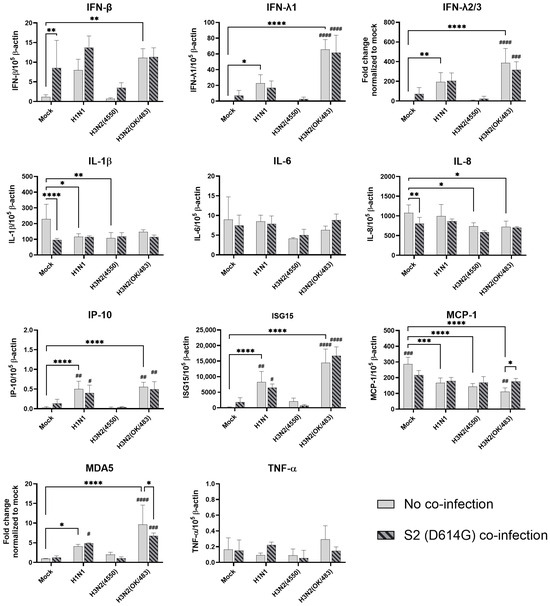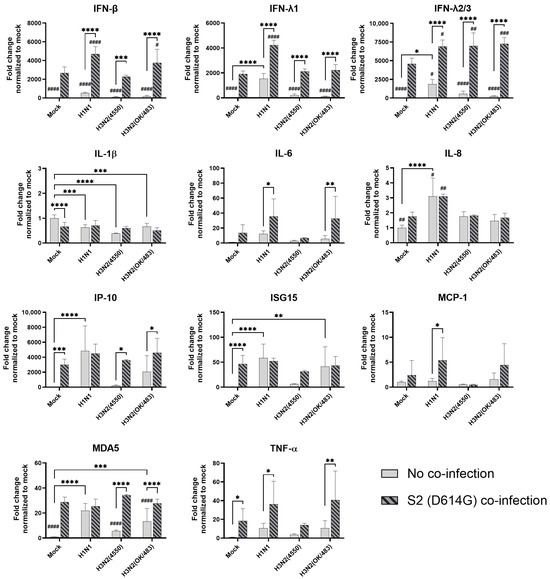 Innate immune responses in human airway epithelial cells co-infected with SARS-CoV-2 and the H1N1 and H3N2 influenza A viruses. The mRNA expressions of the cytokines and chemokines in Calu-3 cells infected with SCoV2/D614G and/or influenza A viruses (H1N1 and H3N2), measured with quantitative PCR at 72 h post-infection. Data are presented as the mean values ± SD (N ≥ 3), analyzed with two-way ANOVA followed by Tukey’s test. Hashtag # denotes the statistical significance in comparison to SCoV2/D614G single infection. # p < 0.05; ## p < 0.01; ### p < 0.001; #### p < 0.0001. * p < 0.05; ** p < 0.01; *** p < 0.001; **** p < 0.0001.