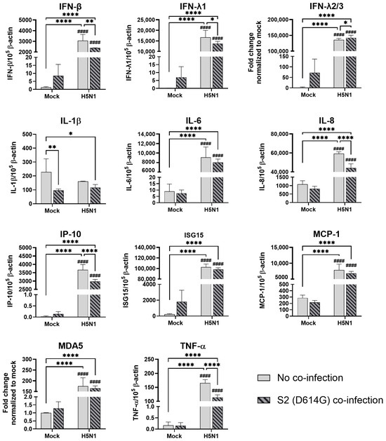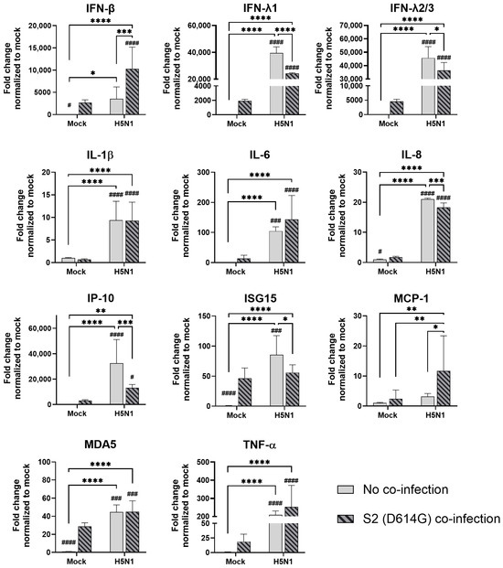 Innate immune responses in human airway epithelial cells co-infected with SARS-CoV-2 and H5N1 influenza A virus. The mRNA expressions of the cytokines and chemokines in Calu-3 cells infected with SCoV2/D614G and/or influenza A viruses (H5N1), measured with quantitative PCR at 72 h post-infection. Data are presented as the mean values ± SD (N ≥ 3), analyzed with two-way ANOVA followed by Tukey’s test. Hashtag # denotes the statistical significance in comparison to SCoV2/D614G single infection. # p < 0.05; ### p < 0.001; #### p < 0.0001. * p < 0.05; ** p < 0.01; *** p < 0.001; **** p < 0.0001.