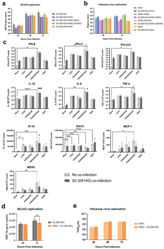 Innate immune responses in human alveolar epithelial cells co-infected with SARS-CoV-2 and the H1N1 and H3N2 influenza A viruses. The mRNA expressions of the cytokines and chemokines in A549/ACE2 cells infected with SCoV2/D614G and/or influenza A viruses (H1N1 and H3N2), measured with quantitative PCR at 72 h post-infection. Data are presented as the mean values ± SD (N ≥ 3), analyzed with two-way ANOVA followed by Tukey’s test. Hashtag # denotes the statistical significance in comparison to SCoV2/D614G single infection. # p < 0.05; ## p < 0.01; ### p < 0.001; #### p < 0.0001. * p < 0.05; ** p < 0.01; *** p < 0.001; **** p < 0.0001.