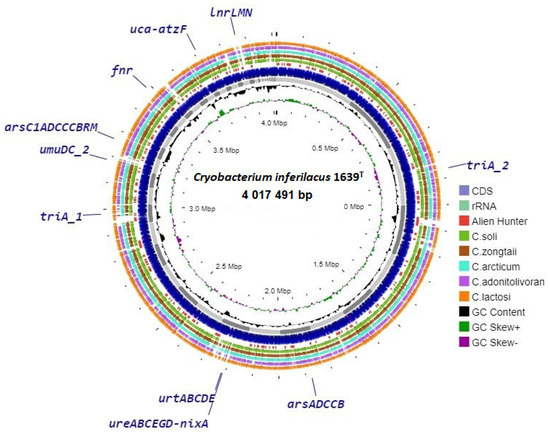 Circular genome map of strain 1639T with BLAST comparison with genomes of closest type strains of Cryobacterium. Abbreviations for unique genes: ureABCFGD-nixA, urease cluster and transmembrane transporter of nickel ions; urtABCDE, urea transmembrane transporters; uca-atzF, urea carboxylase and allophanate hydrolase; arsRC1ADCCCBRM, large arsenic resistance operon; arsADCCB, small arsenic resistance operon; umuDC, protein of DNA-damage-induced mutagenesis; lnrLMN, single multifunctional ABC transporter; triA, melamine deaminase; fnr, Crp-Fnr stress regulator.