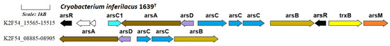 Pan-genome analysis was performed using the bioinformatic pipeline IPGA (https://nmdc.cn/ipga/, accessed on 24 July 2024) version 1.09 [35]. The integrated dbCAN3 meta server, version 4.1.14, was used with default settings to classify the carbohydrate-active enzyme (CAZyme)-encoding genes in the genome of strain 1639T [36]. The reconstruction of possible metabolic pathways was carried out based on comparison of the genome of the strain 1639T using the BlastKOALA tool of KEGG, version 3.1 (https://www.kegg.jp/blastkoala/, accessed on 1 January 2025) [37]; MetaCyc, version 28.5, (https://metacyc.org/, accessed on 11 December 2024), [38]; RAST v. 2.0 (https://rast.nmpdr.org/rast.cgi, accessed on 12 October 2024) [39]; and BV-BRC. The circular genome map of strain 1639T was constructed using the Proksee web service (https://proksee.ca/, accessed on 1 August 2024) [40]. Gene clusters of urea assimilation and arsenic resistance were drawn using the online service Gene Graphics version 2.02 (https://katlabs.cc/genegraphics/app, accessed on 1 October 2024) [41].