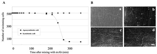 It is known that an anti-SAg antibody immobilizes the swimming activity of Paramecium cells [,,], so SAg is also called the immobilization antigen (i-antigen). In order to confirm that the mAb SAgPC is able to immobilize the swimming activity of Paramecium cells, the aposymbiotic and symbiotic P. caudatum RB-1 cells were mixed with the culture medium of the hybridoma cells containing the mAb. The resultant mixture was then observed to determine whether the swimming activity of the cells was immobilized or not. As demonstrated in Figure 2, the aposymbiotic cells exhibited immobilization in response to the mAb, while the symbiotic cells did not. The aposymbiotic cells began to immobilize at 2 h post-mixing with the mAb, and approximately 91% of the cells were immobilized after 5 h (Figure 2A). In contrast, when the symbiotic cells were mixed with MDS instead of the culture medium of the hybridoma cells, both cells remained immobilized (Figure 2B, a and b). These results indicate that the 266-kDa protein is the SAg (=immobilization antigen) whose swimming activity is immobilized by the mAb. However, about 9% of the aposymbiotic cells were not immobilized even 6 h after mixing. These cells might be expressing different SAgs. The epitope of this mAb is present not only in the 266-kDa SAg of aposymbiotic P. caudatum but also in 300-kDa SAg of P. tetraurelia stock 51 and in the 188- and 149-kDa SAgs of symbiotic P. caudatum (Figure 1B,C). However, the epitopes in these cells were not labeled by indirect immunofluorescence microscopy, presumably because these epitopes were masked. Therefore, the epitope of 9% of the aposymbiotic cells in Figure 2A might be masked or the local culture conditions occurring in the test tubes for Paramecium culture may have altered the expression of the SAg to a different type of SAg.