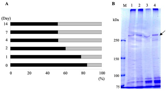 Effects of starvation on 266-kDa SAg expression. (A) Aposymbiotic P. caudatum strain RB-1 cells in the early stationary phase of growth were washed with MDS and suspended in MDS for 1, 2, 4, 7, and 14 days at 25 °C to induce a state of starvation, and the ratio of cells exhibiting FITC fluorescence on their surfaces was examined via indirect immunofluorescence microscopy using mAb SAgPC by observing 150–200 cells each. Black bars, the percentage of cells showing FITC fluorescence, i.e., the percentage of cells expressing 266-kDa SAg. Gray bars, the percentage of cells showing no FITC fluorescence. (B) CBB-stained SDS-PAGE gel. Cell extracts were obtained from starved cells via salt/ethanol extraction 0 (lane 1), 2 (lane 2), 4 (lane 3), and 7 (lane 4) days after washing and loaded onto SDS-PAGE. Slight adjustment in brightness was made in Photoshop without altering or distorting the information in the figure. Lane M, pre-stained molecular mass markers. Arrow, 266-kDa SAg. Note that the 266-kDa band was kept in all lanes and both the 188 and 149-kDa bands did not appear.