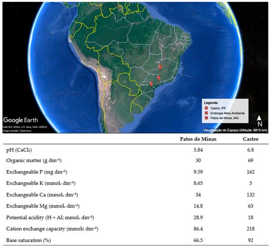 Soil samples were collected in two agricultural fields. The first one is located in the municipality of Castro (24°47′57.4″ S and 49°53′16.7″ W), in the state of Paraná (PR), Brazil. The predominant soil type is Inceptisol (Soil Classification System), and the climate is classified as Cfb (subtropical humid with mild summers—Köppen classification) with an annual average air temperature of 16.8 °C and precipitation of 1553 mm. In this agricultural field, a no-till system was established more than 40 years ago. Crop rotation in this area includes soybeans, corn, wheat, and oats plus an annual application of swine manure. This first area was here considered a field of high soybean productivity, with an average of 5100 kg ha−1.