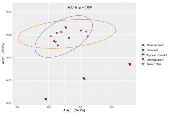 Principal Coordinate Analysis (PCoA) of bacterial communities at 99% similarity, based on 16S rRNA sequences using unweighted UniFrac distances. ADONIS test reveals distinct differences between donor soil and inoculants, with similarities between untreated and treated plants.