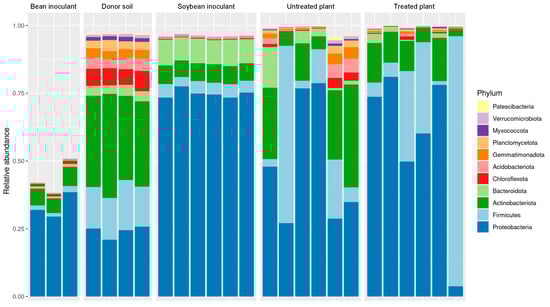 Taxonomic assignments at the phylum level showing the relative abundance (%) of the 16S rRNA gene sequences from different sample types: bean inoculant (microbial preparations from the rhizosphere and rhizoplane of bean cultivated in donor soil), donor soil (highly productive soybean farmland soil), soybean inoculant (microbial preparations from the rhizosphere and rhizoplane of soybean cultivated in donor soil), untreated plant (soybean rhizosphere from a less productive field without soybean inoculant application), and treated plant (soybean rhizosphere from a less productive field with soybean inoculant application).
