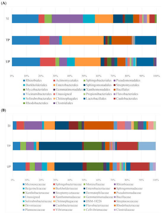Distribution of the most abundant bacterial at the order (A) and family (B) levels based on the 16S rRNA gene sequences from different sample types: soybean inoculant, SI (microbial preparations from the rhizosphere and rhizoplane of soybean cultivated in donor soil); treated plants, TP (soybean rhizosphere from a less productive field with soybean inoculant application); and untreated plants, UP (soybean rhizosphere from a less productive field without soybean inoculant application).